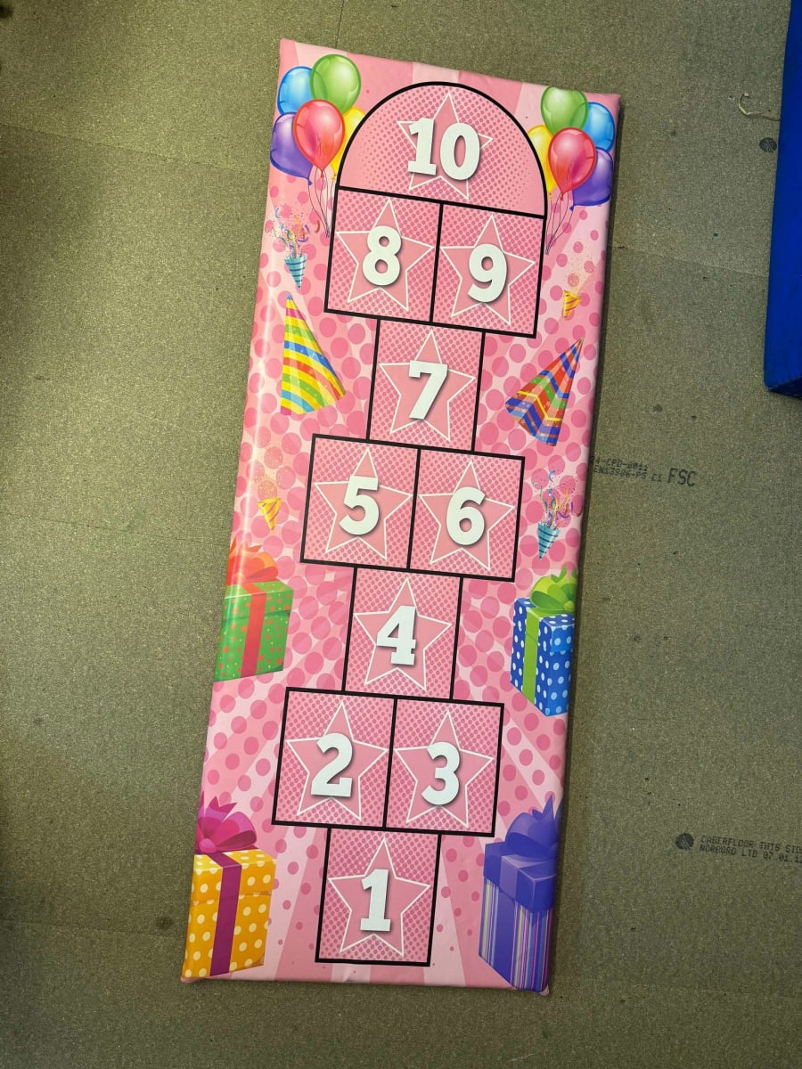 Introducing the Pink Party Hopscotch, a great addition to any event! This vibrant pink hopscotch features a fun, party design with bright balloons and streamers, bringing extra excitement to your celebration.