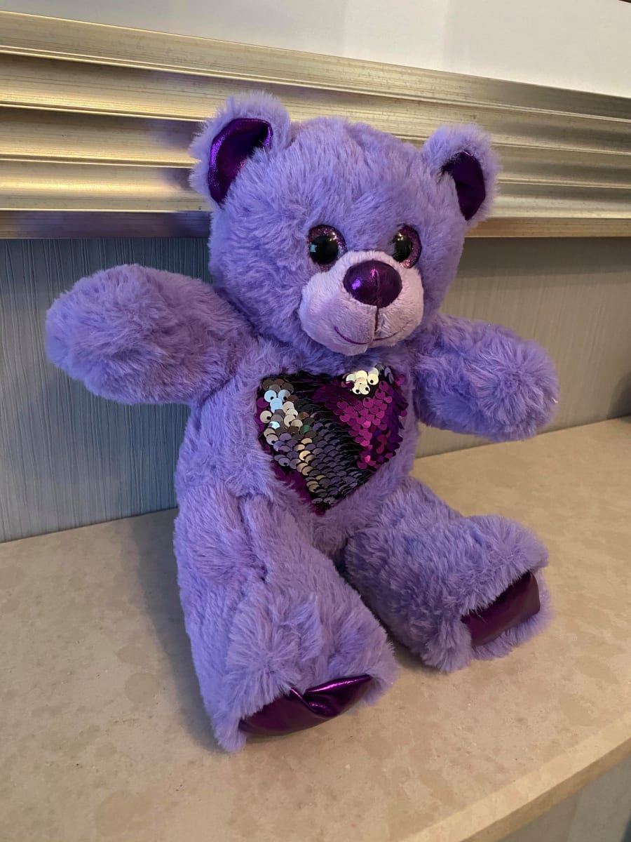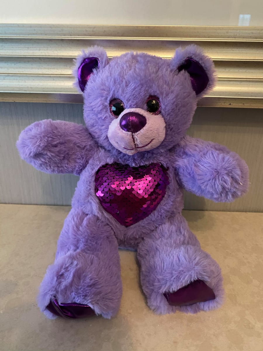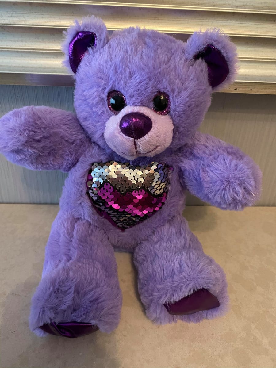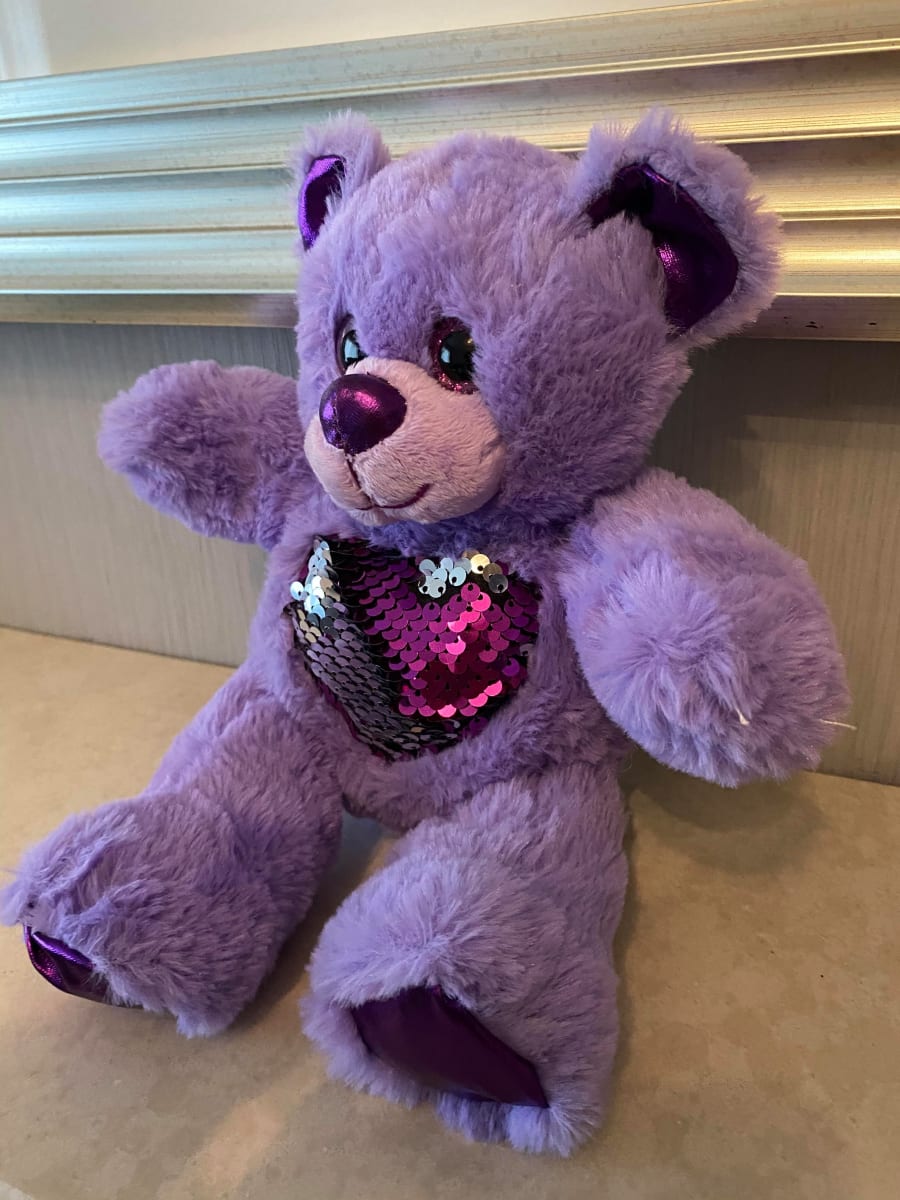 8" Sequin Heart Bear. With soft purple skin and sparkly eyes, featuring a colour change heart sequin panel on the front, this bear is popular with children of many ages.