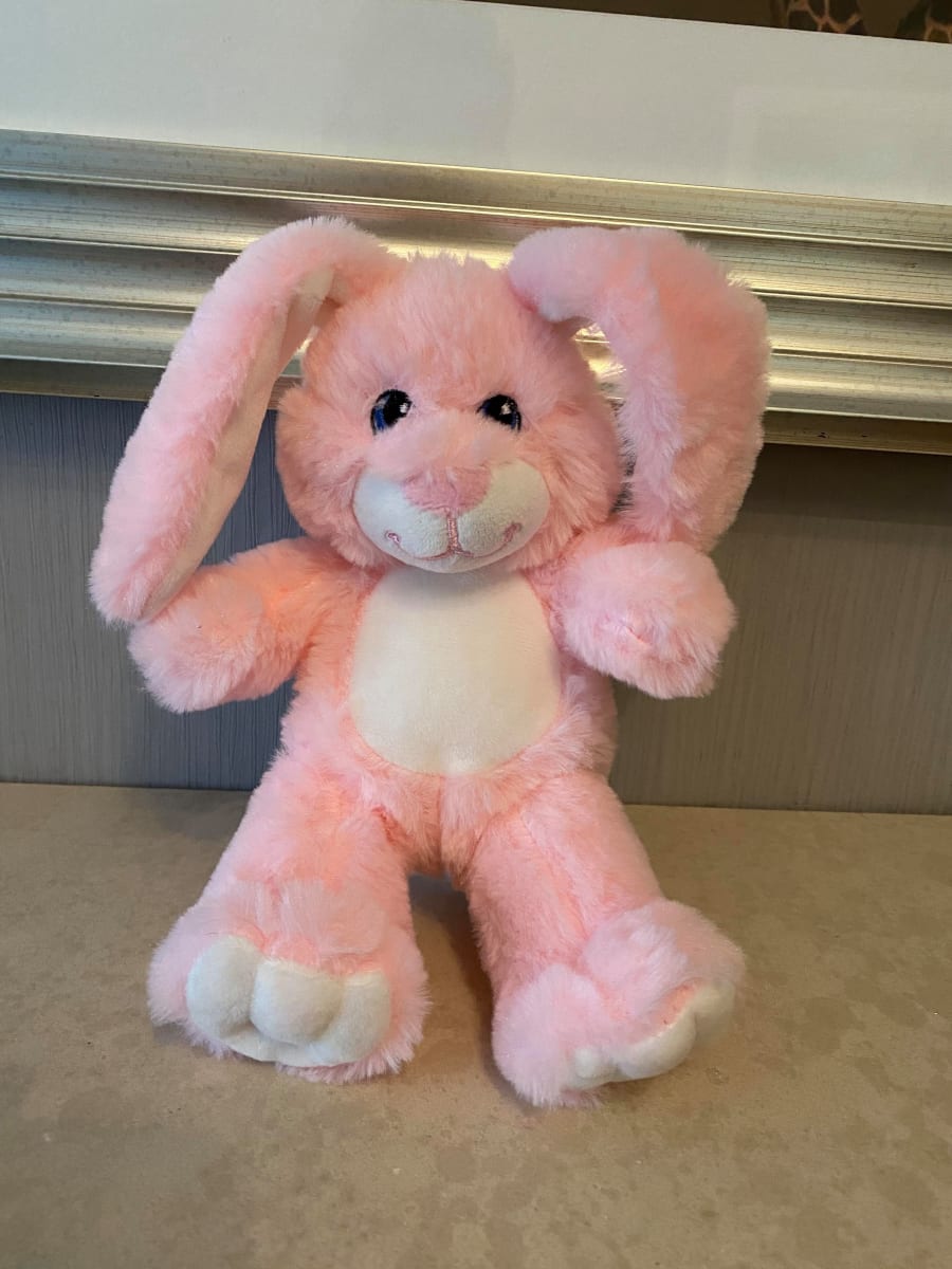8" Pink Bunny. Soft and snuggly with stitched eyes and long floppy ears, blue bunny is the perfect gift for a new arrival or an Easter treat.