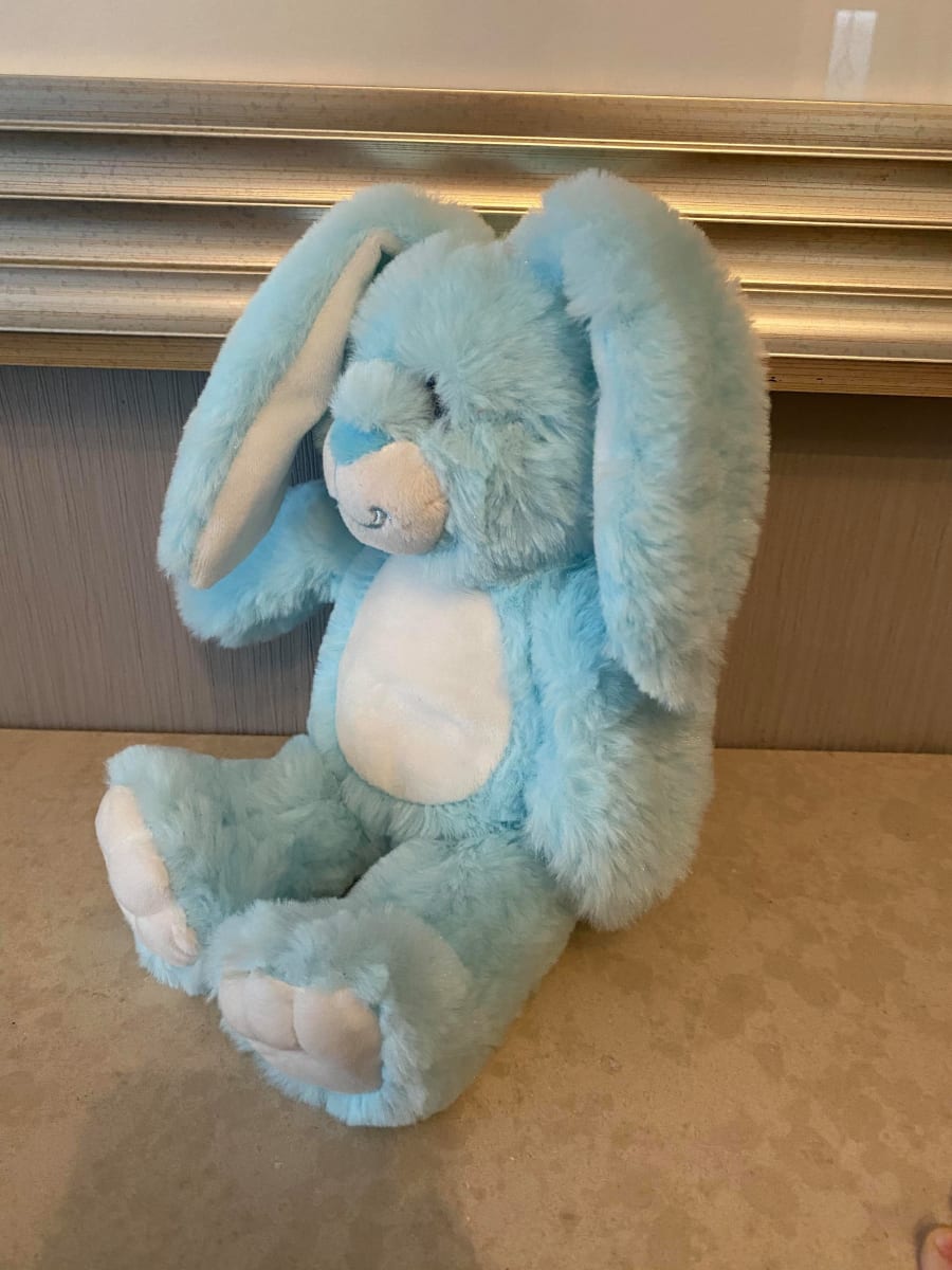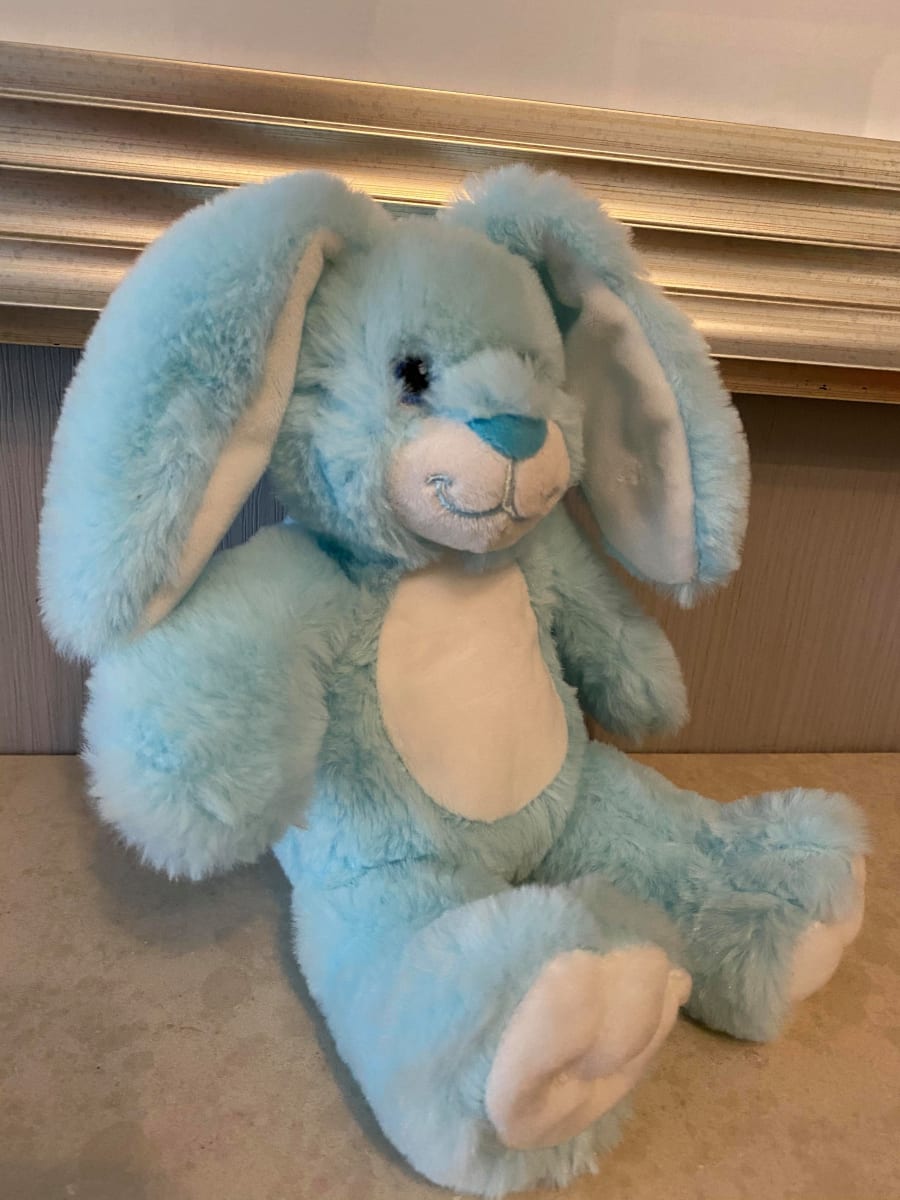 8" Blue Bunny. Soft and snuggly with stitched eyes and long floppy ears, blue bunny is the perfect gift for a new arrival or an Easter treat.