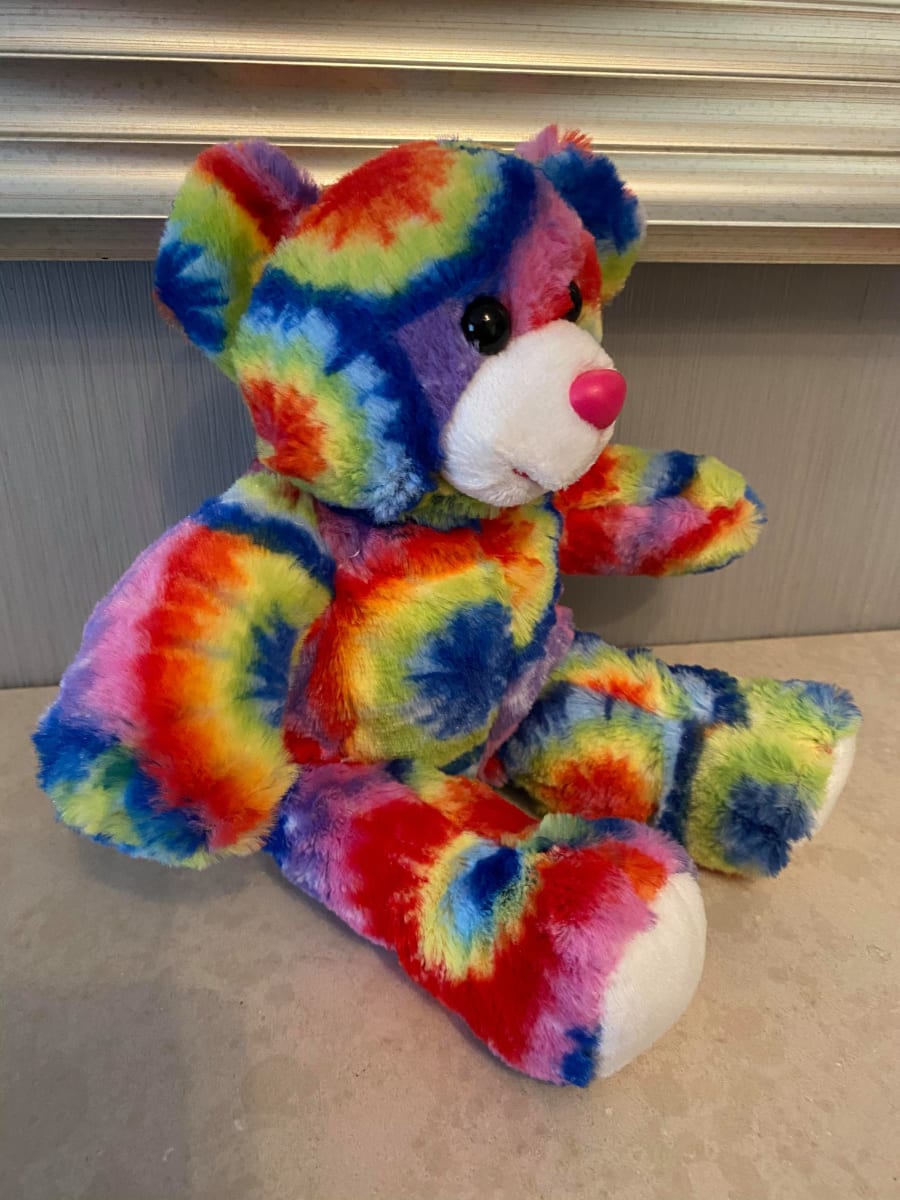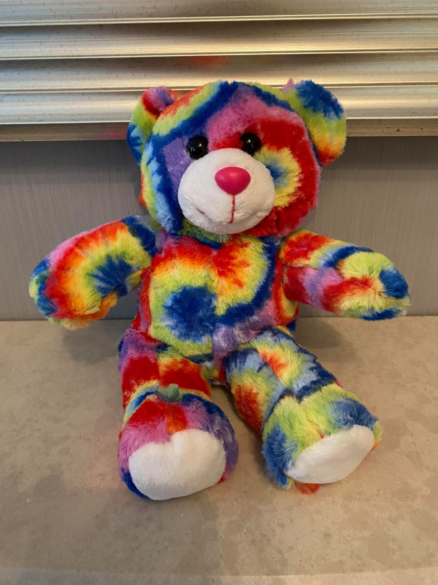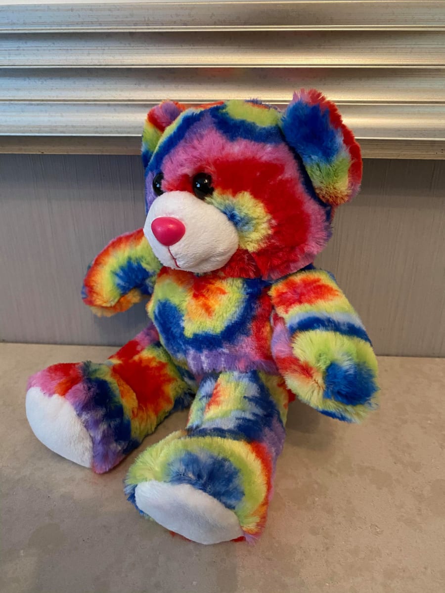 8" Multicolour Bear. Bright multicoloured tie dye effect fur makes this bear really stand out, perfect for boys, girls and even adults.