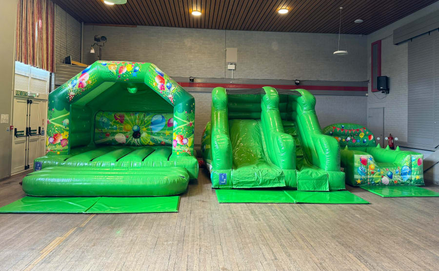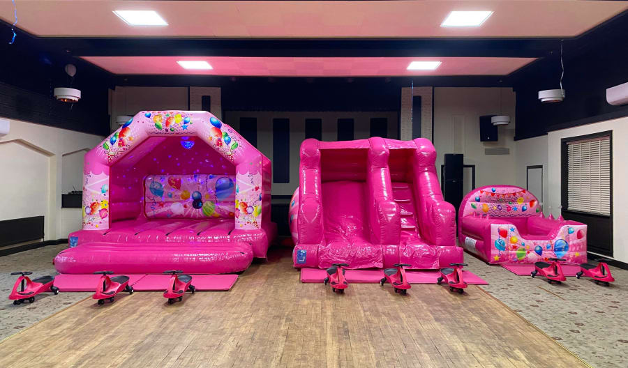 This package includes a 12x12 Disco Bouncy castle, complete with disco light & Bluetooth speaker, 5ft platform slide and an inflatable air juggler ball pool.