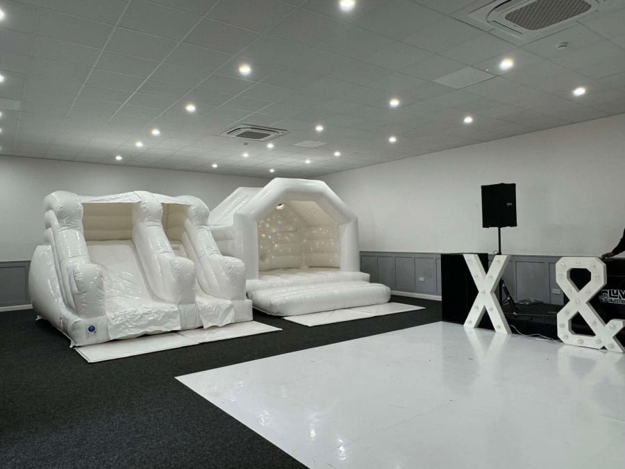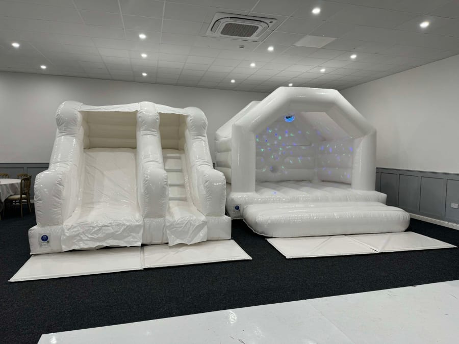Gloss White Disco Bouncy Castle & 5ft Platform Slide Package.