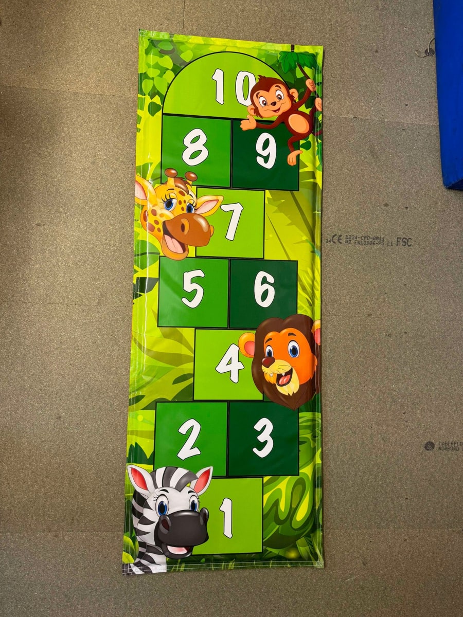 Let your children embark on a thrilling adventure as they hop, jump, and skip through the jungle-themed hopscotch.Featuring a variety of vibrant jungle animals, including a monkey, lion and more. This interactive play mat not only promotes physical activity but also encourages imaginative play.