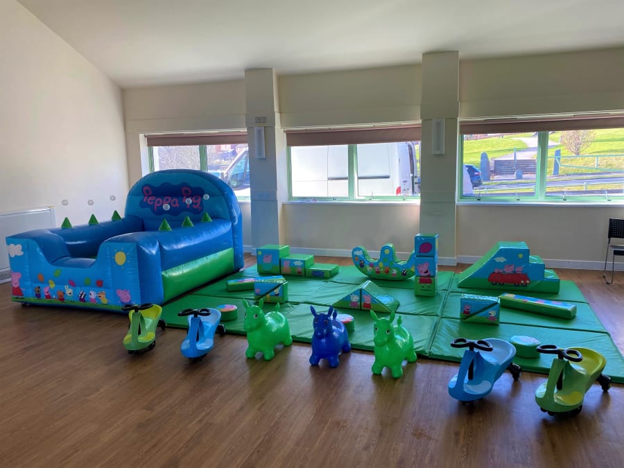 The package comes with Peppa Pig themed soft play shapes perfect for building stacked puzzles and anything your kids creative minds can think of. A step and slide and a matching double rocker. We also provide animal hoppers that are extra bouncy and perfectly contoured for your kids to sit comfortably on.